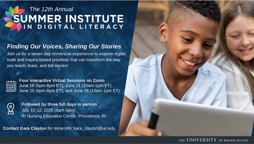 Together, by embracing the theme "Finding Our Voices, Sharing Our Stories," you helped us unlock the power of digital storytelling at the University of Rhode Island’s 12th Annual Summer Institute in Digital Literacy. Each day of the Summer Institute builds on the previous day, so all participants attended all four virtual sessions and the three full days in-person in Providence, RI. Click here to learn more about the experience and hybrid schedule from 2025.
